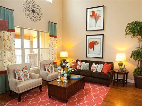 rust living room yellow teal sitting brown grey rooms cream accents area schemes coral sofa hgtv drapes transitional denver parade